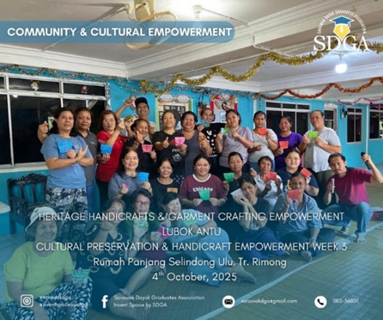 Held at Rumah Panjang Selindong Ulu, Tr. Rimong, this week’s Heritage Handicrafts and Garment Crafting Empowerment workshop was led by SDGA member and EXCO Jacob, together with trainers from Stinablis. The session introduced participants to innovative and sustainable techniques for repurposing discarded plastic bags into creative and practical products.